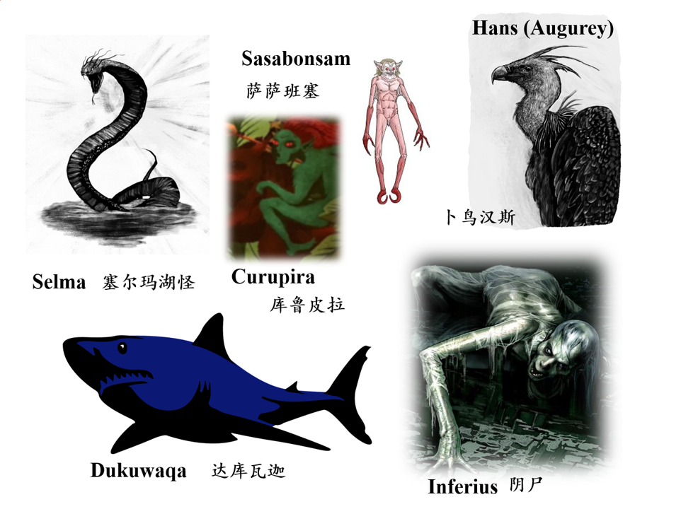 -巴西的吉祥物:库鲁皮拉,巴西本土生活在森林的红发矮人。它们对于其他魔法生物的保护欲很强,会在它们认为人类伤害其他魔法生物时主动站出来保护。它们的脚向后生长。库鲁皮拉的头发是臭名昭著极为不稳定的魔杖杖芯,这种魔杖常常与强大而难以捉摸的巫师相吸引。第52版《神奇动物在哪里》没有提到这种生物。[库鲁皮拉在巴西的传说中有着倒长的脚丫,可以迷惑猎人走到相反的方向。他们会袭击它们认为对于森林的资源过于贪得无厌的人。]