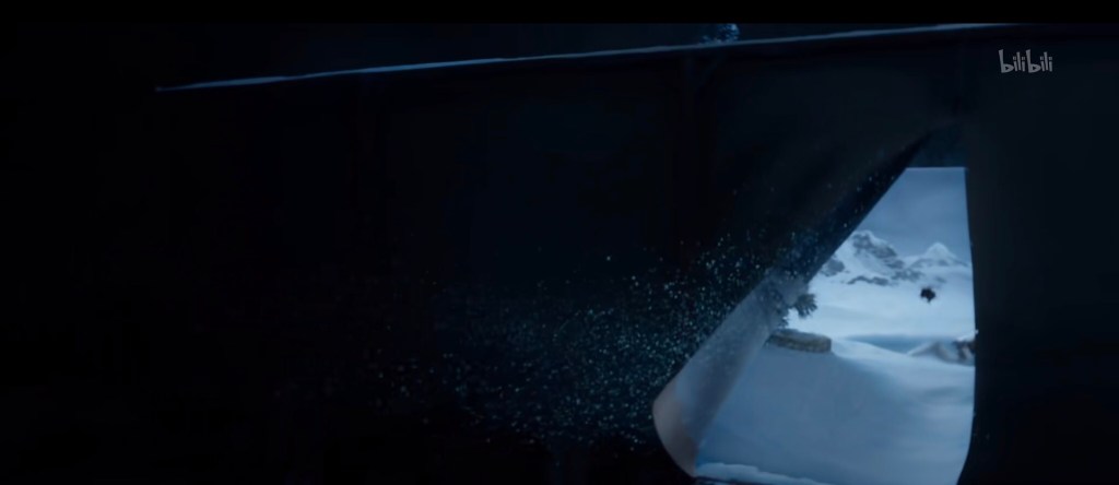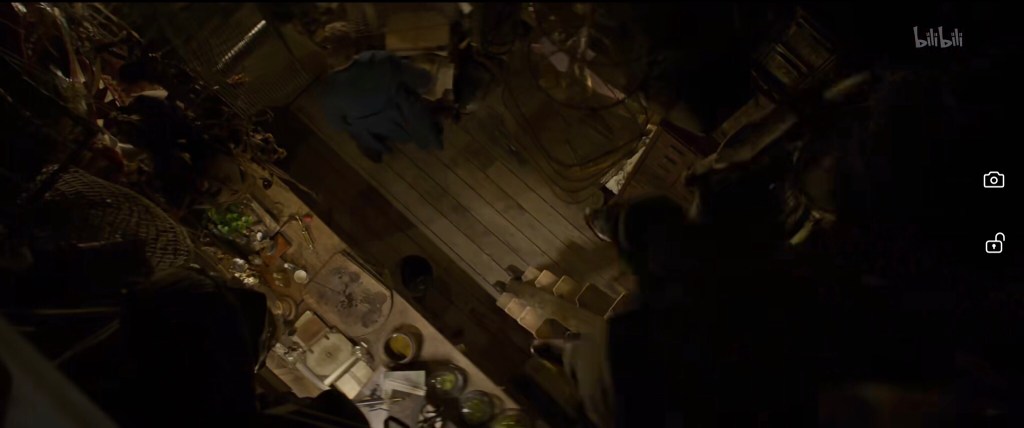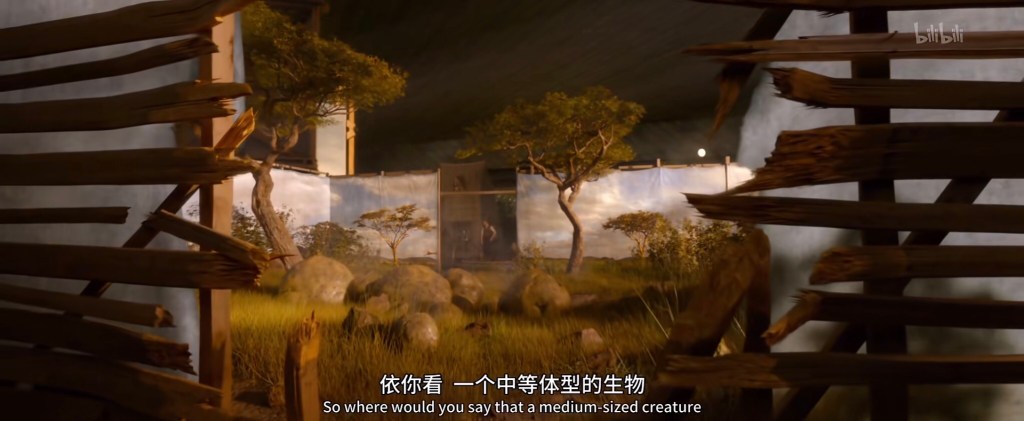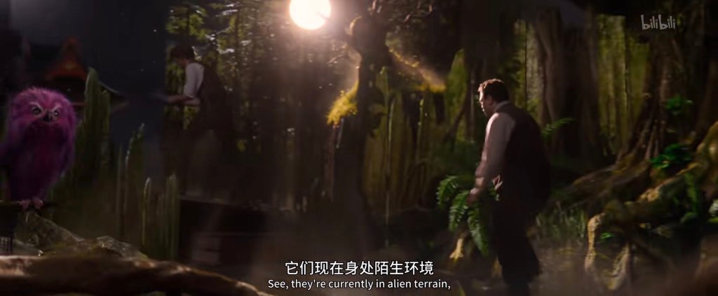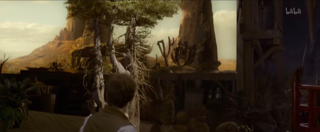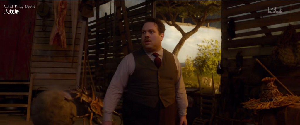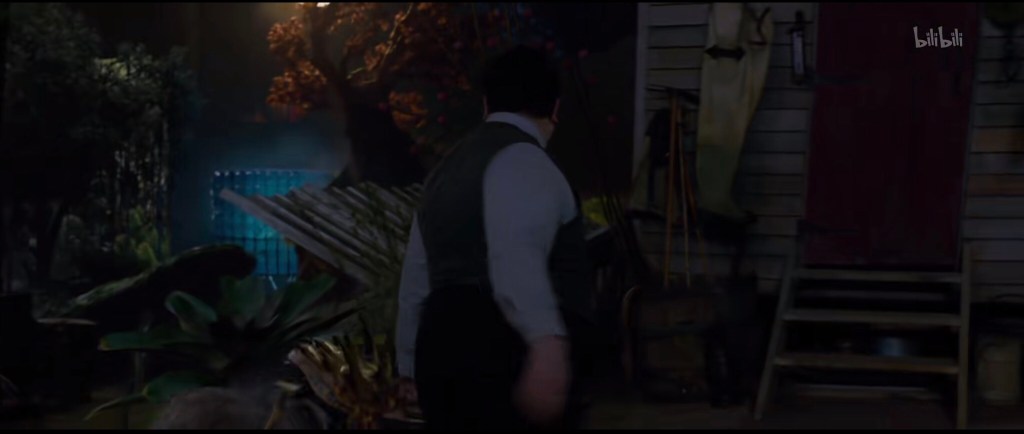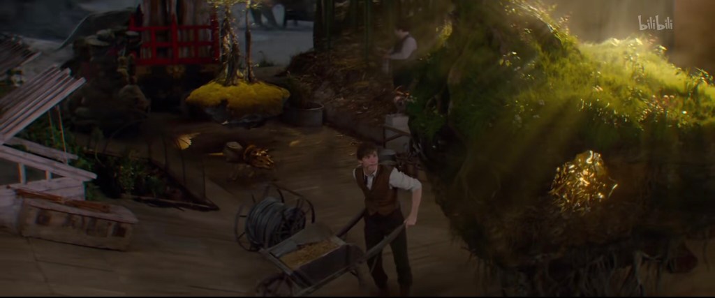 接下来纽特和雅各布分开行动,纽特推着小车上斜坡去喂毒囊豹,雅各布去喂月痴兽。这个上面狐媚子下面是洞穴的看起来似乎是嗅嗅的地盘(与删减版中对比,当然删减版特效不够):